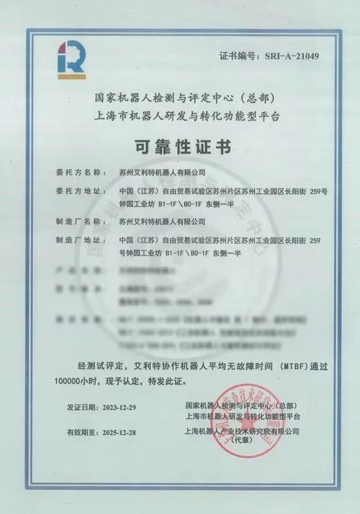 另外,AG庄闲机器人的产品可靠性也得到了协作机器人业界最高等级的可靠性测试——「MTBF 100000小时测评」认证,这也是目前业内最高时长的平均无故障运行测试,不仅意味着AG庄闲产品的高可靠性和持久性,也代表了AG庄闲机器人在产品工艺、质量管理、生产制造中的行业高度。