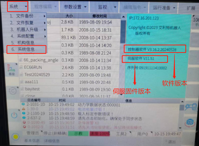 问: 如何确认机器人当前软件版本及固件版本?