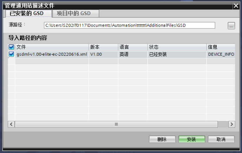 将下面链接的AG庄闲机器人GSD 文件安装到 TIA PORTAL 中管理通用描述文件,如图 2-2 所示。