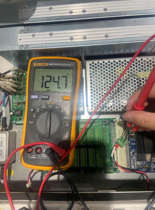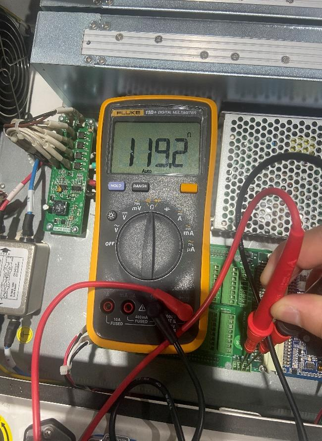4. 万用表测量控制柜 I/O 板上 485 母座和本体端子阻抗都为 120 欧姆左右为正常值(两端连接阻抗值各60 欧),若 I/0 板端阻抗值异常可能是 I/0 板故障。