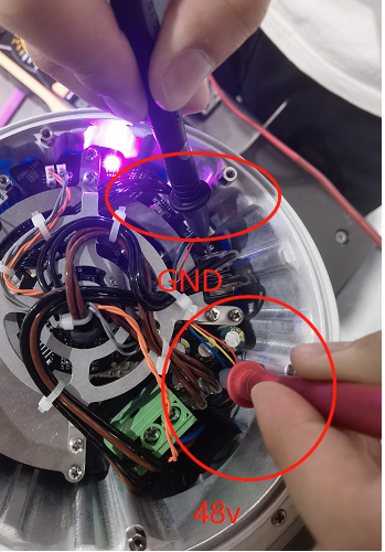 6.  拆开端盖检查1轴驱动板上指示灯是否正常亮起和测量电压是否正常48v。如电压不正常可能是电源线缆或驱动板电源芯片故障导致无法正常供电。棕线端子是48V,黑线端子是GND。