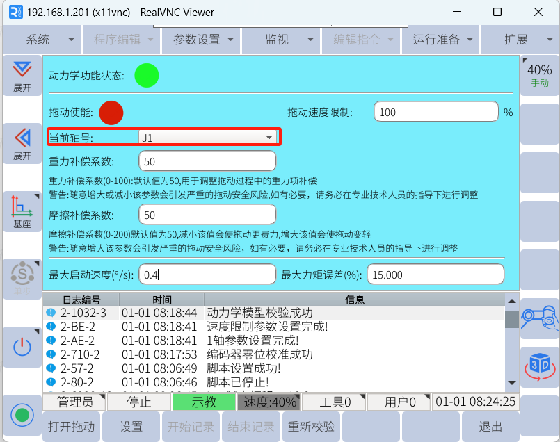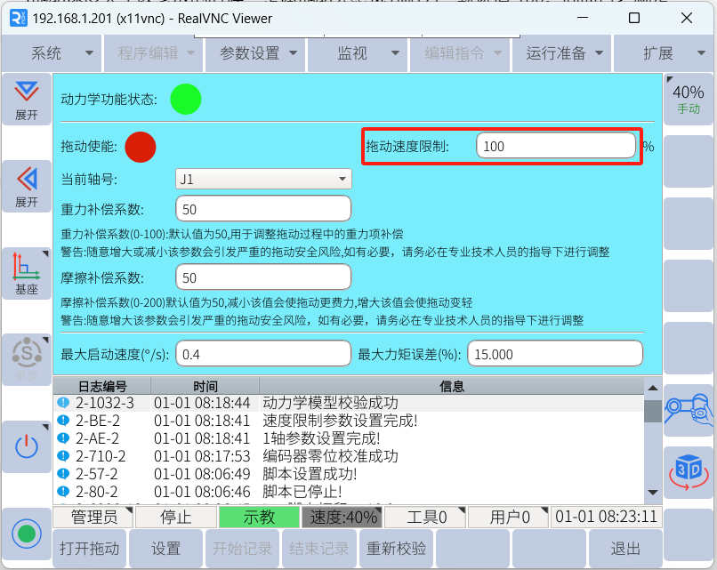 打开拖动,拖动某个关节时感觉摩擦力较大,拖动比较费力,可将该轴的摩擦补偿系数调大,参数值越大,摩擦力越小,拖动越轻松。数值设置的越小,摩擦力越大,拖动越吃力。默认值为 50,建议可设置 60-90 之间,不建议设置到 100,默认50。