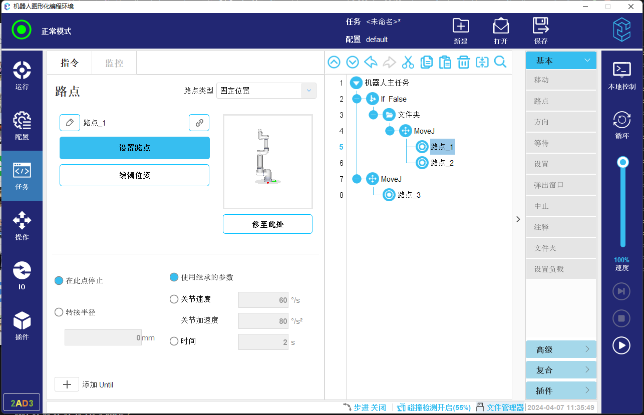 ● 固定位置路点与原点任务节点:程序运行时如果机器人不在该路点或原点位置,则会弹出手动运行到位置的页面,让用户手动控制机器人,移动到起始位置。如图-1所示