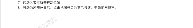 - 机器人触发急停后,电磁式抱闸不会活动,插销式有小范围活动,因此也可以通过触发机器人急停来判断关节抱闸类型;