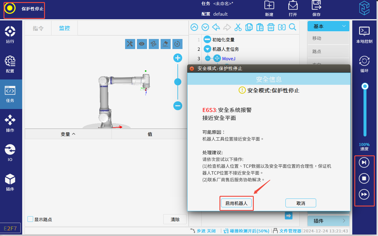 机器人末端TCP超过安全平面时会进入到恢复模式;正常情况下机器人会在接近安全平面时就会暂停运行,此时会进入保护性停止,机器人会暂停程序,此时只需点击启用机器人即可