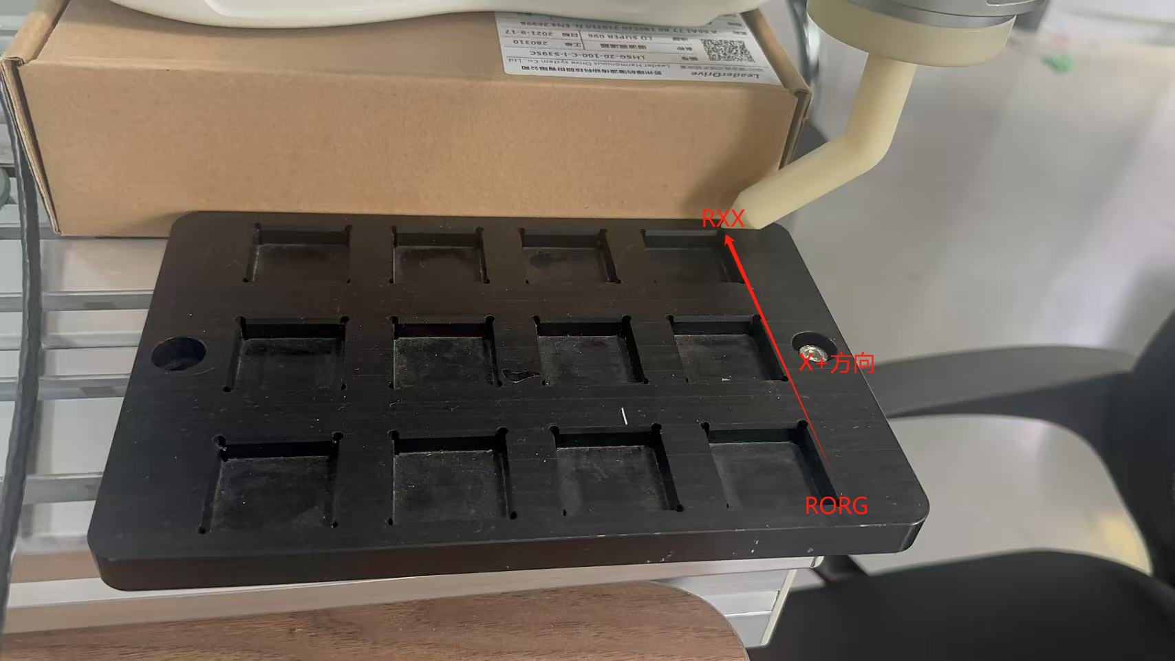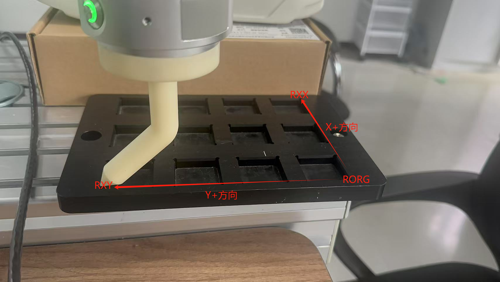 2. 2 选择8号坐标系>>示教三个点,RORG对应X和Y方向原点,RXX对应X+方向,RXY对应Y+方向,非正交的RXY需要基于原点精准示教出来,Z+方向是计算出来。注意:X+和Y+方向不能在同一直线内。建议机器人末端安装尖点,坐标系精度更高,如下图中三个点示教位置: