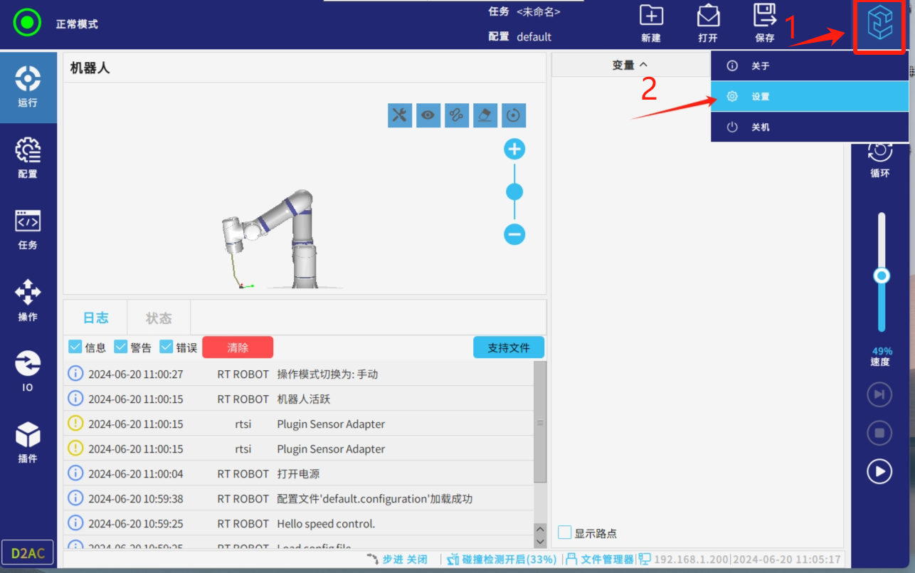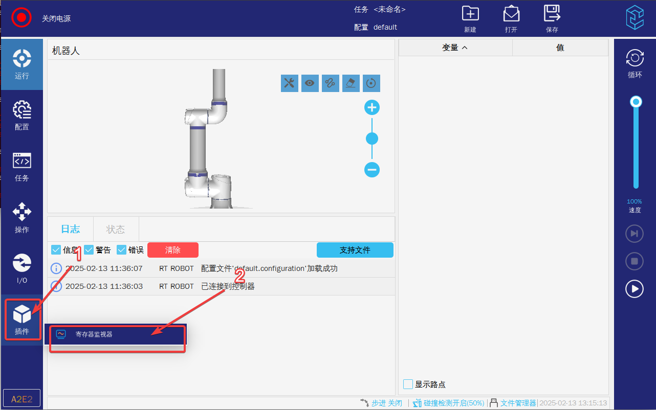 1. 点击示教器屏幕左侧底部插件按钮,再点击寄存器监视器进入插件界面;