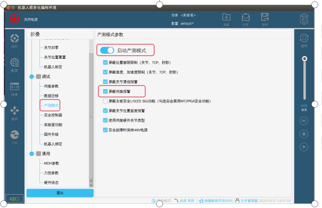 第二步:在专家模式下,选择产测模式,启用产测模式,勾选屏蔽伺服报警。如图-2红框标记所示。