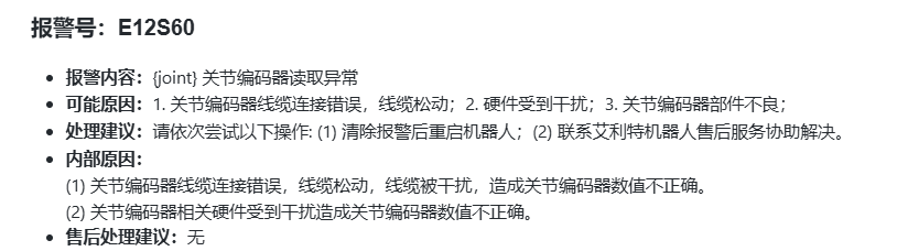 2. 数字释义:“12” 指代伺服报警;“60” 明确为 {joint} 关节编码器读取异常。