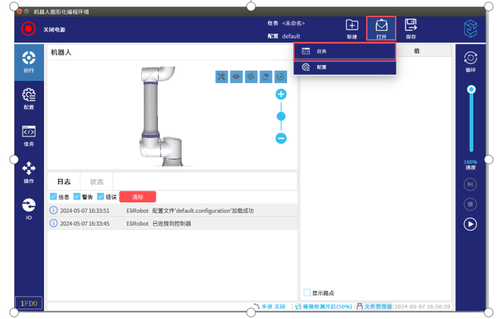 第一步:按照2.4.4操作方法选择与备份程序相对应型号的机器人,然后打开虚拟示教 器