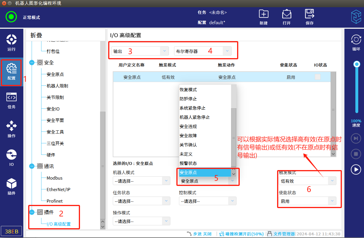 3. 配置modbus信号为安全原点信号输出,要求:应用版本要求2.11及以上,IO/高级配置插件版IOExtensionConfig-1.2.11.1及以上(modbus通讯机器人作为主站时建议使用)