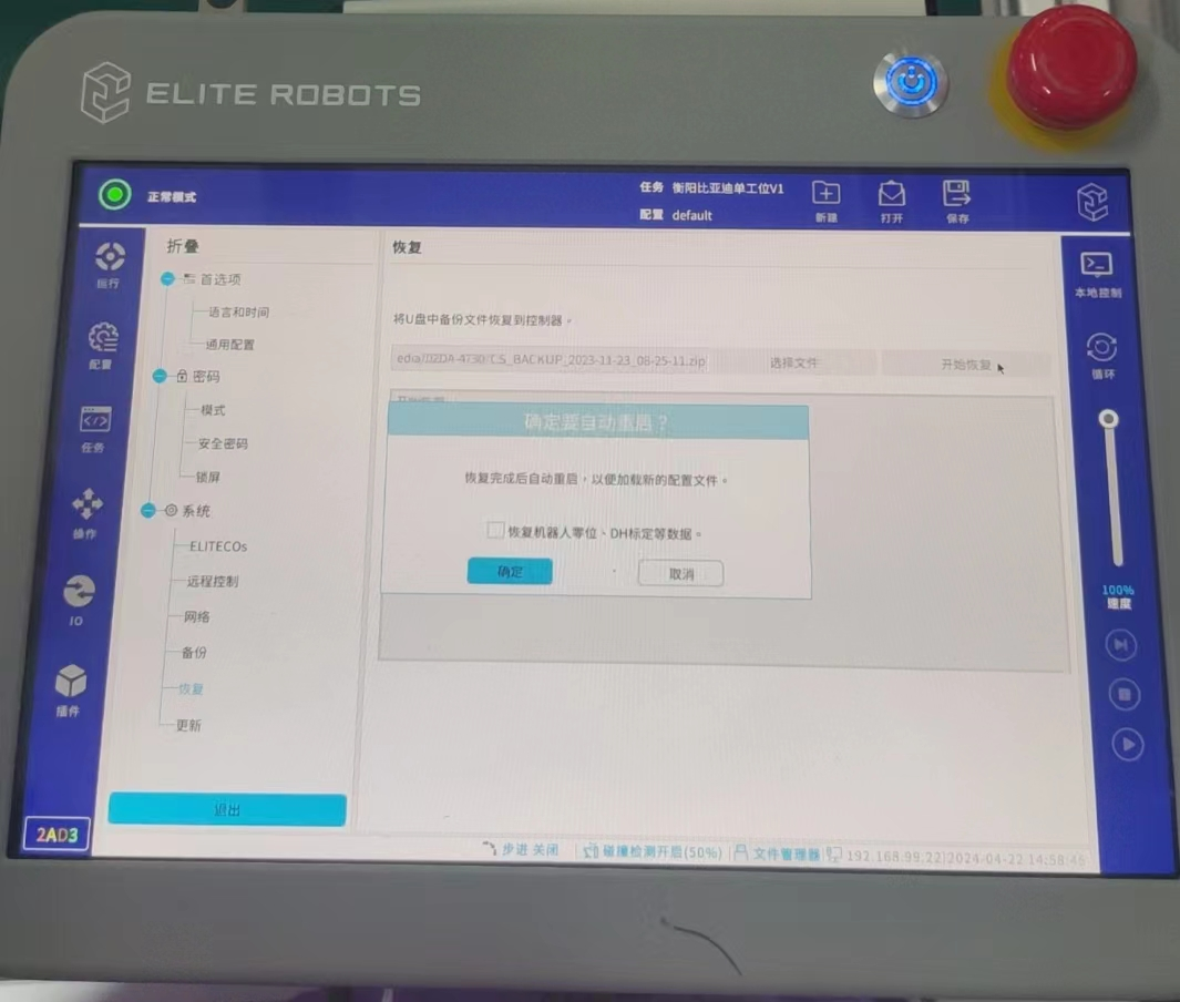 3、 恢复备份文件时不勾选【恢复机器人零位、DH标定等数据】,该数据每台机器人不通用,勾选后恢复会影响实际运行,该功能用于换机;