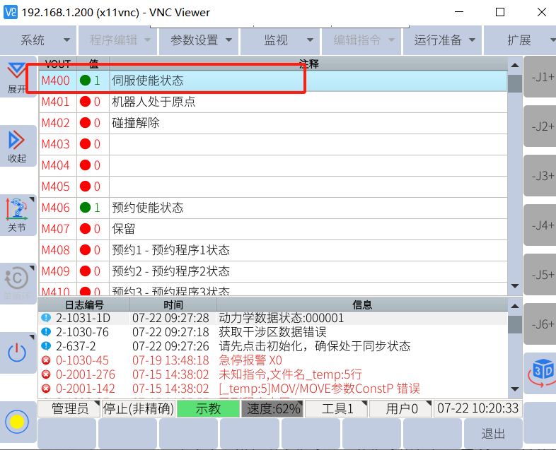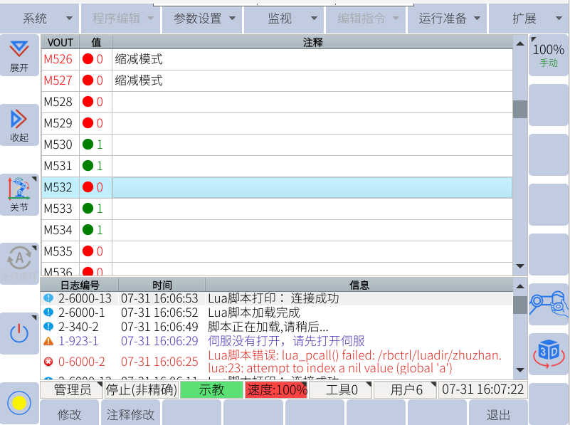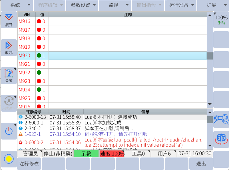 示教器中查看对应的M920、M922、M924分别状态为1,读取线圈功能及指令正常