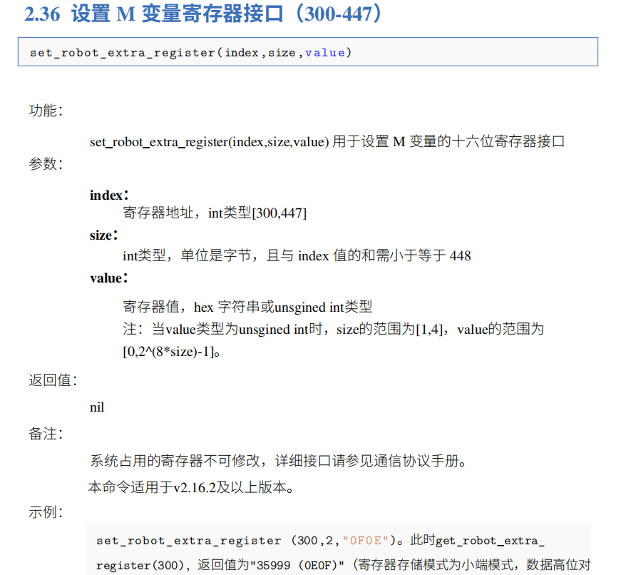 4).第1种指令和第2种指令,建议用户使用第2种指令更方便快捷,第1种指令可直接控制M变量,AG庄闲modbus寄存器分为8位和16位,需要在兼容模式下更改,否则容易将机器人寄存器地址和网络助手地址混淆。第2种指令本身设置就是16位寄存器,无需考虑兼容模式下的更改情况
