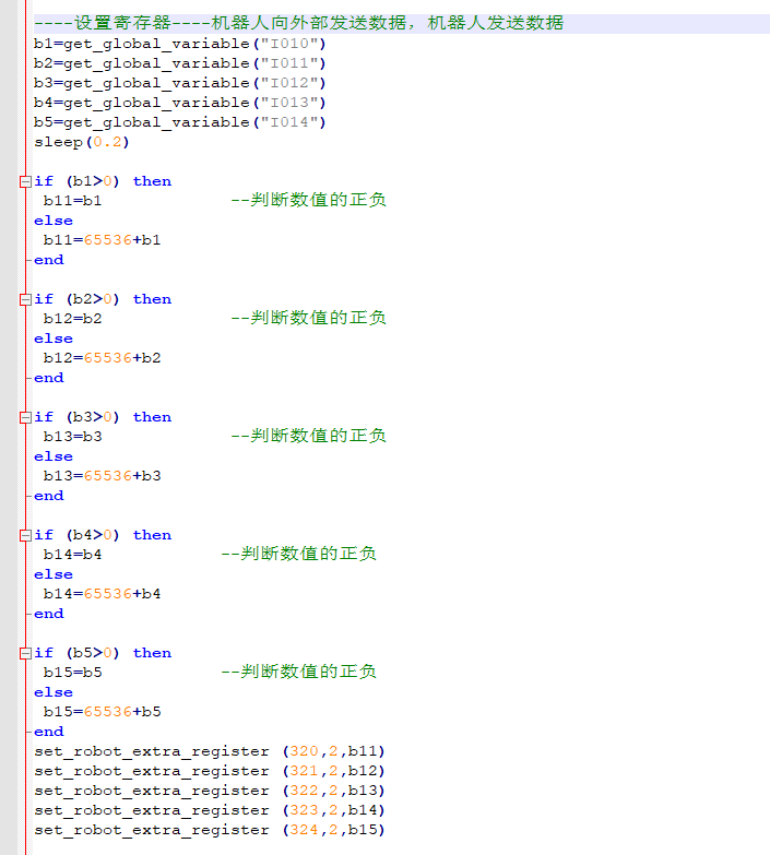 6).机器人通过全局变量I10-I14,将数据写入寄存器320-324,脚本如下所示