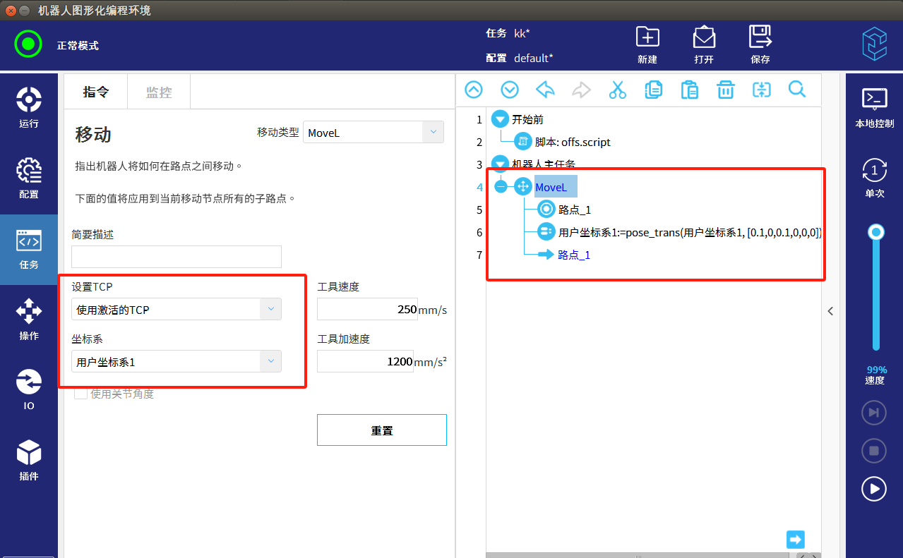 先添加移动指令坐标系改成基座标系,和当前的使用的tcp。